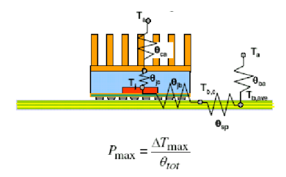 Heatsink performance is characterized by its thermal resistance. This parameter can be thought of as the difference in temperature between the air around the heatsink and the device surface in contact with the heat sink per unit of input power. Thermal resistance is denoted by the symbol θ and has the unit °C/W.